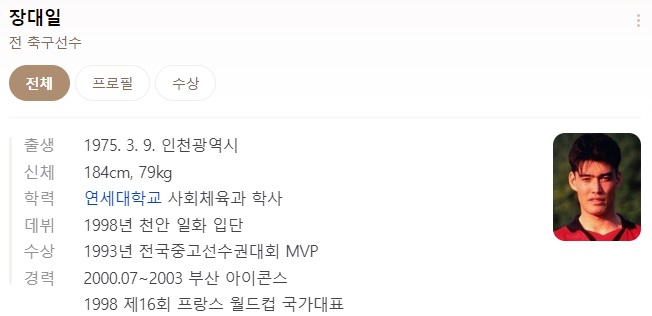 특히 프랑스 월드컵때 미남 베스트 11에 선정될 정도로 인기가 좋았습니다 장대일은 어린시절부터 축구와 연이 깊어 운동을 시작했는데 고등학생때는 공격수로 활약했지만 대학교를 졸업한 뒤에는 감독의 지시를 따라 수비수로 훈련 받았습니다 국가대표로 선발된건 1997년 당시 차범근 감독의 눈에 띄어 혼혈임에도 불구하고 최초로 국대 선수로 발탁이 되었고 실력을 증명이라도 하듯 경기를 뛰면서 맹활약을 펼치면서 좋은 성적으로 보답했습니다