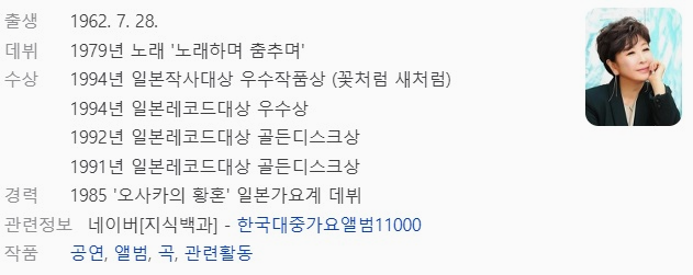 한국에서는 부진했던 인기가 아이러니하게도 일본에서 엄청난 화제를 끌며 잘 나가는 가수로 활동을 펼쳤으며 한국의 트로트라 할수있는 엔카 가수로 오랫동안 활동하며 대표적인 프로그램 홍백가합전에 7회 연속 무대에 서는 영광을 누렸습니다