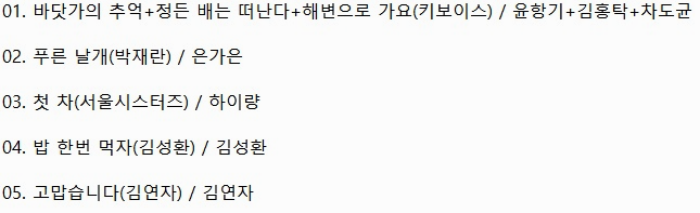 첫번째로 출연하는 가수는 윤항기, 김홍탁, 차도균 세 분이 뭉쳤습니다 여름하면 떠오르는 노래들이 몇 있는데 대중들에게 사랑 받았던 바닷가의 추억, 정든 배는 떠난다, 키보이스의 해변으로 가요를 열창할 예정입니다 막바지 여름을 보내며 들어봐도 좋을거 같아요