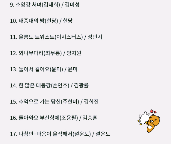 또한 오랜만에 가수 나미애가 부르는 한강을 들어볼수 있는 자리가 마련되었습니다 1984년에 데뷔했고 무려 30여년동안 무명시절을 겪어야 했지만 주저앉지 않고 묵묵히 자신의 길을 갔기에 현재는 대중가수로 이름과 얼굴을 알리고 활발한 활동중입니다 2024년 1월 신곡 앨범도 냈더군요