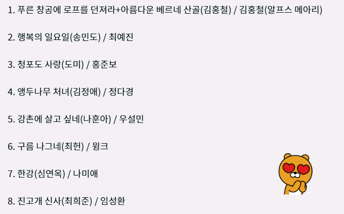 오늘 가요무대 출연진은 젊은층도 함께 보기 지루하지 않은데 그 이유가 mz 트로트 가수들이 대거 출연하기 때문입니다 부캐 미쓰정으로 좋습니다를 부르며 여러세대를 사로잡은 정다경과 트로트 가수 양지원의 추억속으로 안내하는 노래 감상해보세요