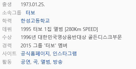 그동안 연예인이라는 가오를 많이 내려놔서 마음이 편해진 탓인지 센스있고 재밌는 말솜씨로 엄청난 예능감을 선보였으며 여러 방송에 출연하면서 활동했습니다 50대의 나이에도 천진난만하게 웃는 모습이 선해보여요 현재 근황은 행사, 콘서트 무대에 종종 서서 터보 완전체 모습을 보여주는데 반갑고 추억이 방울방울 떠올랐네요