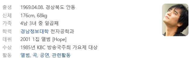 그 뒤로 라이브의 황제라는 타이틀까지 얻게 되었는데 2001년 1집 앨범을 발표하면서 가요계에 데뷔를 했고 꾸준하게 신곡을 발매했습니다 정규앨범 5장과 싱글앨범 그리고 드라마 ost 까지 부르는 등