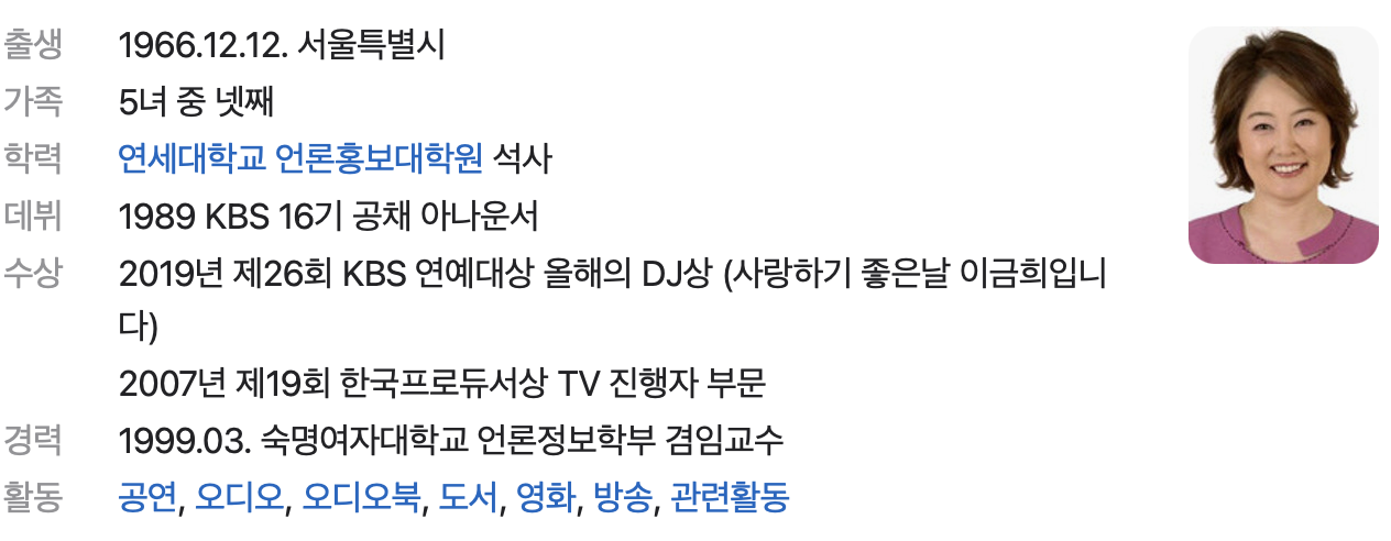 그 중 오랫동안 대중들의 사랑을 받으며 여러 방송에서 따뜻한 진행자로 마음을 사로잡은 이금희 아나운서가 생각납니다 꾀꼬리처럼 맑은 목소리에 차분한 말투로 이금희는 보고 있으면 마음이 편해지는데요