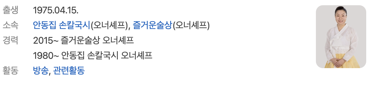 보여주고 싶었고 가게를 찾는 손님들에 대한 예의라고 생각했습니다 김미령 셰프 식당은 안동집 손칼국시, 즐거운 술상 두 곳에 오너로 있으며 가족은 부모님, 남편, 자녀 1남 1녀를 두고 있습니다
