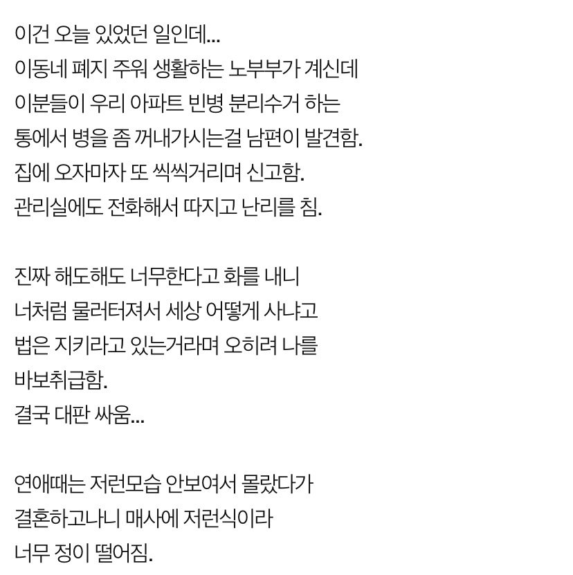 들었습니다 그냥 눈감고 넘어갈일을 하나하나 집고 넘어가야 속이 풀리는 성미 같았어요 융통성이 없다고 해야할까 도덕성이 강하면 좋겠지만 저건 거리가 멀어보여요 충분히 정이 떨어질만 합니다 피곤할거 같아요 정의로운게 아니라 짜증이...