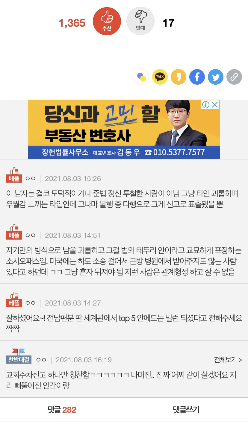 사연에 대한 베플들 공감이 갑니다 도덕적이거나 준법정신이 투철한 사람이 아니고 그냥 사소한거까지 태클걸어서 남을 괴롭힌다는 말이 정답인거 같아요 정말 다른 쪽으로 표출됐더라면;; 좀 무서울거 같군요