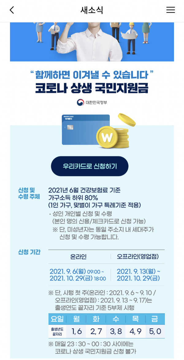 신청하는 방법과 설명이 자세하게 나와있습니다 온라인으로 신청해도 되지만 어렵다면 은행을 직접 방문해도 무관합니다 출생연도에 따라 시행하고 있으니 본인의 출생년도를 잘보고 신청해야 합니다 우리카드로 신청하기 누르면