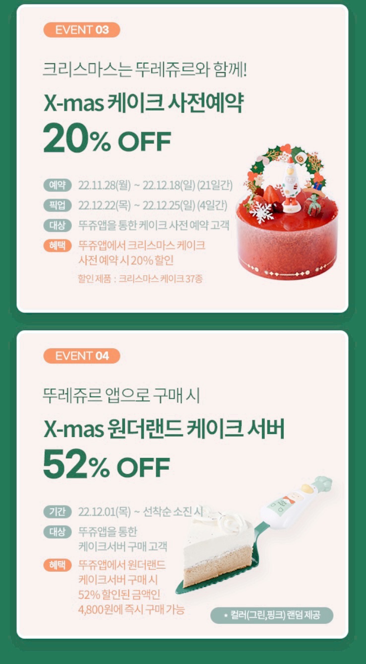 뚜레쥬르 앱을 다운받고 신규가입을 하면 혜택을 받을수 있습니다 크리스마스 케이크도 20% 할인되구요 사전예약은 12월 18일까지이며 굿즈는 소진될때까지 진행된다고 하니 서두르시길 바랍니다