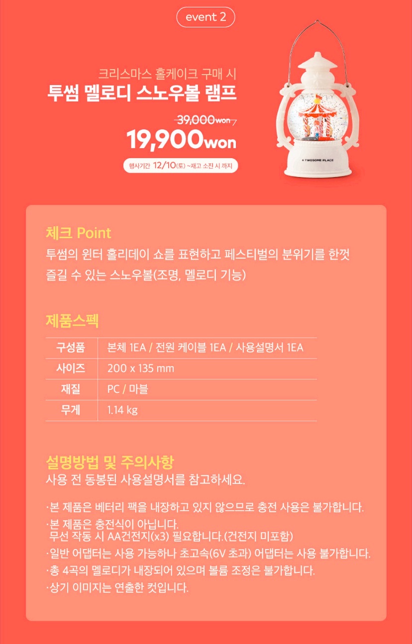 - 행사기간 : 불꽃 가습기는 11월 25일부터 재고 소진시 스노우볼 램프는 12월 10일부터 재고가 소진될때까지 진행됩니다 ( 램프는 아직 기한이 있으니 경쟁이 치열하겠어요)