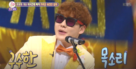 처음 무대를 본건 일요일의 국민 방송이라 할수 있는 전국 노래자랑 이었는데 선글라스를 끼고 붉은 의상에 장구를 치며 노래를 부르는 모습은 관객들을 휘어잡는데 충분했습니다