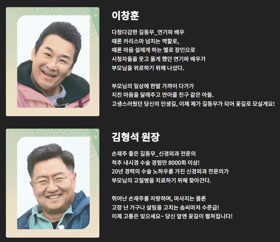 특히 나이든 어르신들은 관절과 척추를 무리하게 사용하여 질환을 가지고 있고 치료하고 싶어도 돈 때문에 참고 사시는걸 보곤 합니다 꽃길만 걸어요 프로그램은 김형석 신경외과 원장님이 병을 치료해주고 함께 길동무를 자처한 탤런트 이창훈이 출연중이며