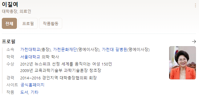 이길여는 어릴적부터 머리가 좋아 우수한 성적을 유지했고 서울대학교 의과대학을 졸업했습니다 자신의 이름을 건 산부인과를 개원하여 운영을 했으며 이후 1964년도에 뉴욕으로 건너가 유명한 세커리 메리 이메큘레이터 병원에서 인턴생활을 하며 의료지식을 쌓았고 종합병원 레지던스까지 수료를 완료하였습니다 현재는 가천대학교 초대 총장으로 학교를 알리는 홍보역할을 톡톡히 하며 다양한 분야에서 활동중입니다 오래오래 건강하시길 바랍니다
