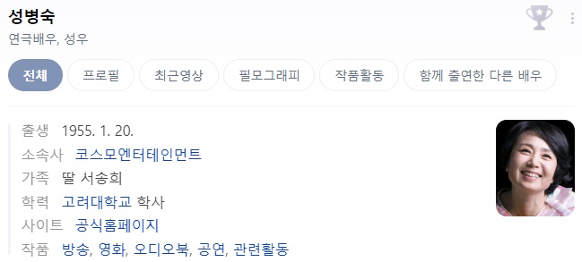 그래도 아직까지 여러 분야와 프로그램에서 활발히 활동하는 성우분들을 만날수가 있는데 1977년 TBC 성우로 입사하여 활동을 하다가 이후 연극, 영화, 드라마 작품에서 연기력을 펼치고 있는 성우 겸 배우 성병숙 님이 있습니다