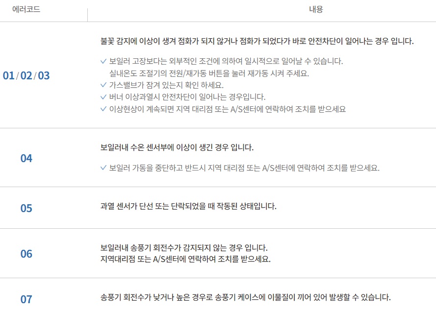 - 귀뚜라미 보일러 에러코드 01 02 03 : 불꽃 감지에 이상이 생겨서 점화가 이루어지지 않거나 점화가 되었어도 안전차단이 되는 경우입니다