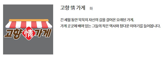 전부다 재미있고 정겹지만 화요일 코너 오래된 노포소식을 가득 담아 소개하고 있는 고향가게 입니다 리포터는 배우 백봉기 님과 가수 라마님이 번갈아가면서 소개를 해주고 있는데 디게 오래된 코너로 알고 있거든요 그만큼 볼수록 매력있고 전국 방방곡곡 숨어있는 옛가게들을 알려주는 코너라 유용하고 도움이 됩니다