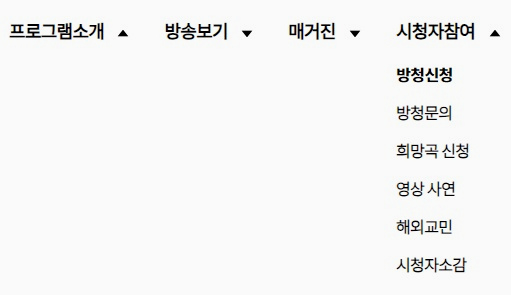 간단하게 설명하면 어렵지 않습니다 순서대로만 쭉쭉 나가보면 금방 신청완료 입니다 자세히 알려드리자면 전체메뉴를 눌러서 시청자참여 클릭 맨 위에 있는 방청신청을 눌러줍니다 혹시 가요무대 시청하다보면 희망곡 신청을 할수도 있는데 여기 게시판에서 간단한 이유와 듣고 싶은 음악을 신청해주면 됩니다