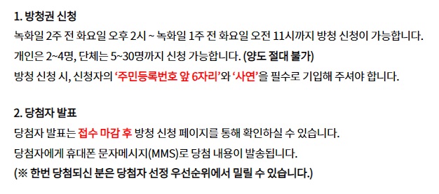 방청권 신청은 녹화일 2주전부터 1주일전까지 신청을 할수가 있습니다 그 이후엔 마감되어서 페이지가 닫혀져요 티켓은 개인일 경우 2~4명 단체는 5~30명까지 신청할수 있으며 양도는 안됩니다