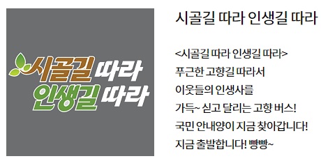 6시 내고향에서는 월요일부터 금요일까지 특별한 코너로 시청자들의 오감을 자극하는데 가장 풍성하고 재미있는건 수요일 시골길따라 인생길따라 코너입니다 제가 제일 좋아하는 코너인데 어르신들의 아이돌 버스 안내양 가수 김정연이 오랜만에 다시 복귀하여 진행을 하고 있어요